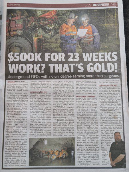 For those that don’t know, there is a job within the mining industry (not entry level), that is currently paying between $2500 to $3000 a day for those at the top of their game. The job is a Twin Boom Jumbo Development Operator and it pays $2500 Per Day in Mining. The West Australian Newspaper has just done an article about it that we featured in, the article pictured and a link is below
